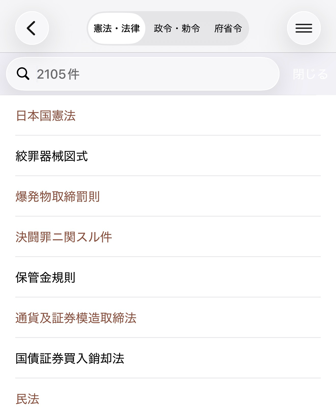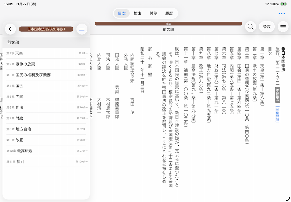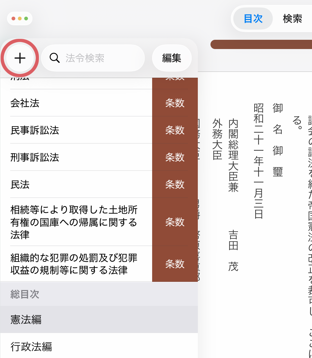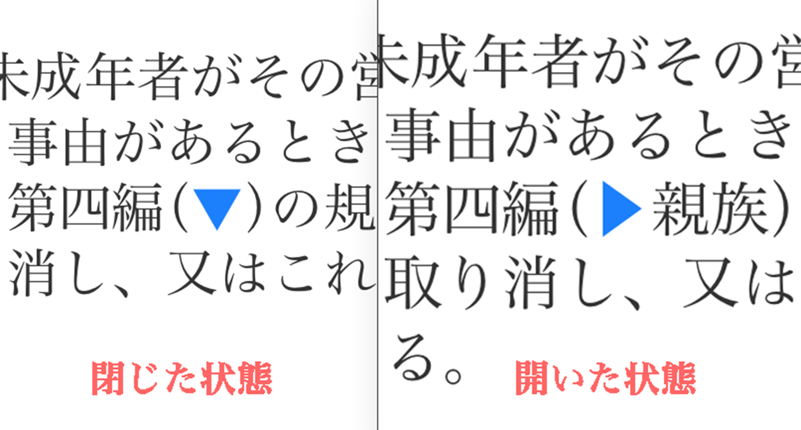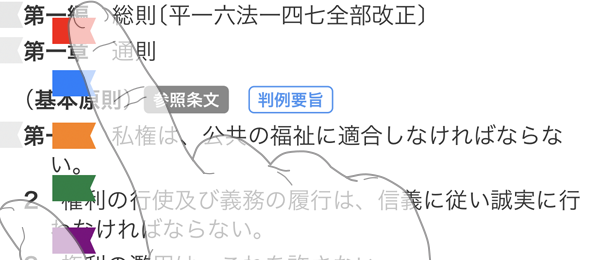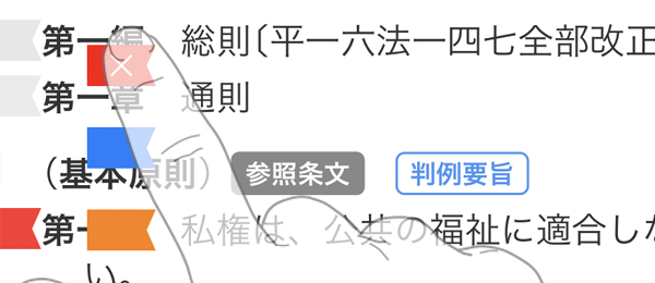 このページでは「六法 by 物書堂」の使い方を説明します。この説明はバージョン1.13に基づいたものとなるため、一部説明で使用している画像が本製品と異ることがあります。説明を見るには、各項目名をクリックまたはタップすることで開くことができます。また、下の全項目を開くボタンからすべての項目を開くことができます。