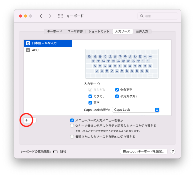 - 「入力ソース」タブに移動し、左下にある+ボタンをクリックします。