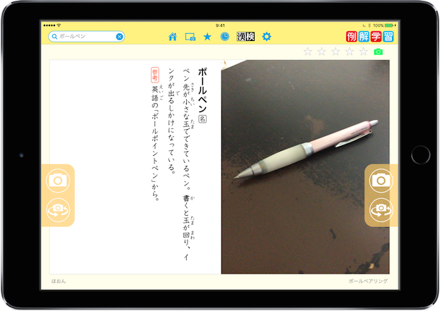言葉とイメージを結びつける。調べた言葉にカメラで撮影した画像を貼り付けておくことが出来ます。気になった言葉を調べて、カメラで写真を撮りながら、自分だけの辞書を作っていきましょう!