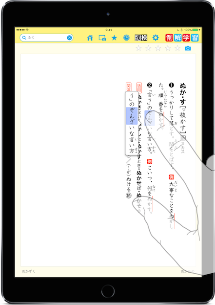 調べ出したら止まりません。「大辞林」では文章中の任意の文字列を選択して、その言葉へジャンプする「なぞってジャンプ®」機能を搭載しています。文字列の選択は選択位置の拡大表示機能により簡単に行なえます。複数の候補がある場合は検索などと同様、縦書きのリストから選択できます。これは?と思う言葉があればどんどん指でなぞってジャンプしてください。