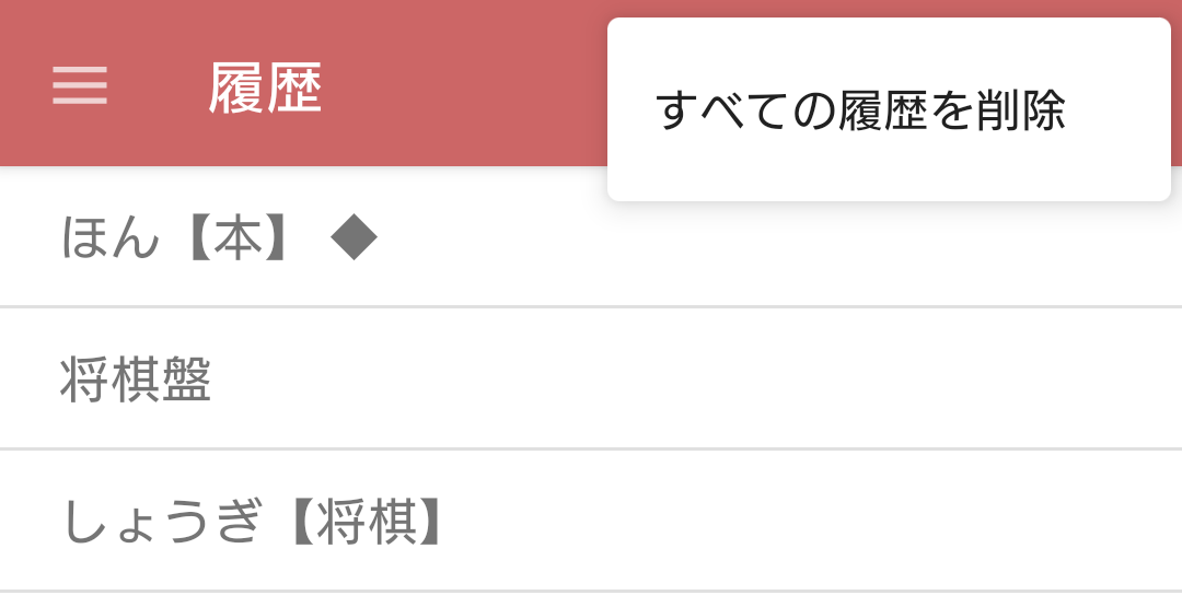 このページでは Android版「NHK 日本語発音アクセント新辞典」の使い方を説明します。 説明を見るには、各項目名をクリックまたはタップすることで開くことができます。また、下の全項目を開くボタンからすべての項目を開くことができます。 すべて開く すべて閉じる 基本的な使い方 基本的な使い方 基本機能である「検索」に加え、「ブックマーク」「履歴」「付録」などのメニューを切り替えて、それぞれの機能を使用します。 メニューは画面上部にある三本線ボタンをタップすることで開くことができます。 メニュー画面に含まれる4つの画面の機能概要は次の通りです。 「検索」画面では、検索を行うことができます。「見出し」以外に「複合名詞」「助数詞」の種別に加え、方向一致検索を行うことができます。 「ブックマーク」画面では登録したブックマークの表示及び編集ができます。 「履歴」画面では、直近に表示した単語の履歴の表示及び編集ができます。 「付録」画面では収録されている付録を閲覧することができます。 この説明のURLをコピー × 閉じる 検索 検索する メニューより「検索」ボタンをタップし、検索画面を表示します。 キーボードが表示されていない場合には、画面上部の検索フィールドをタップします。 オンスクリーンキーボードが表示されます。 検索したい文字を入力します。1文字入力するごとに検索結果が絞り込まれ検索結果として一覧表示されていきますので、すべての文字を入力しなくても目的の項目がリストアップされます。 この説明のURLをコピー × 閉じる 検索文字を消去する 既に入力されている文字をすべて消去するには、検索フィールド右端のボタンをタップします。 この説明のURLをコピー × 閉じる 検索方法を切り替える 本製品では、辞書コンテンツに応じて最適な検索種別を用意しています。 見出検索:辞典の各単語の見出を検索します 複合名詞:二個以上の語が、複合して成立した名詞を検索します 助数詞:ものの数え方が記載されている項目を検索します(本など) これらの検索方法は、検索結果画面に表示されている「見出」「複合名詞」「助数詞」などをタップする事で切り替えることができます。 また、「前方一致」「後方一致」「完全一致」検索にも対応し、より条件を絞り込んですばやく調べたい言葉にたどり着く事ができます。 前方一致:入力された文字列で始まる語句を検索します 後方一致:入力された文字列で終わる語句を検索します 完全一致:入力された文字列に完全に一致する語句を検索します こちらの検索方法は、画面下部にある検索方法のボタンをタップし、リストから選択して切り替えることができます。 この説明のURLをコピー × 閉じる 内容を閲覧する 内容を閲覧する 検索リストから目的の項目の内容を表示した後は、その内容を閲覧します。 内容が画面に収まっていない場合、内容をスクロールさせる事ができます。 親指と人さし指を開くようにピンチさせて、内容を拡大する事ができます。 青い再生ボタンを押すと発音を再生することができます。 この説明のURLをコピー × 閉じる ブックマーク ブックマークに登録する ブックマークに登録したい画面を表示します。 画面右上のブックマーク追加ボタン(しおりの形をしています)をタップします。 登録されると色がつきます。再びタップすることでブックマークを解除することができます。 この説明のURLをコピー × 閉じる ブックマークを表示する メニューより「ブックマーク」ボタンをタップし、ブックマーク画面を表示します。 登録したブックマークの一覧が表示されます。 表示したいブックマークをタップします。 タップしたブックマークの内容が表示されます。 この説明のURLをコピー × 閉じる ブックマークを削除する ブックマーク画面でブックマークを削除する場合は、削除したいブックマークを左にスワイプする事で削除する事ができます。 この説明のURLをコピー × 閉じる 履歴 検索履歴を表示する メニューより「履歴」ボタンをタップし、履歴画面を表示します。 登録した履歴の一覧が表示されます。 表示したい履歴をタップします。 タップした履歴の内容が表示されます。 この説明のURLをコピー × 閉じる 履歴を削除する 「履歴」ボタンをタップし、履歴画面を表示します。 削除したい履歴を左にスワイプして削除します。 この説明のURLをコピー × 閉じる すべての履歴を削除する 「履歴」ボタンをタップし、履歴画面を表示します。 画面右上にある●が三つ縦に並んだボタンをタップします。 「すべての履歴を削除」のボタンがされるのでタップします。 アラートが表示されるので「実行」をタップします。 この説明のURLをコピー × 閉じる